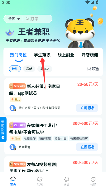 1、先点“学生兼职”,像打开校园招聘小铺,各路零工岗位整整齐齐排好队。