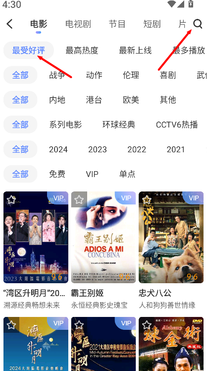 3、选择“最受好评电影榜”,即可查看高评分影片的推荐列表。