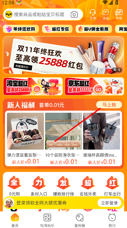 1、进入首页后点击“新人福利马上抢”,即可查看平台为新用户准备的专属优惠活动。