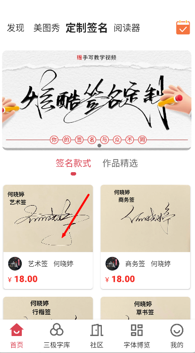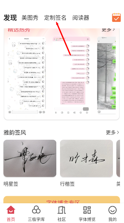1、打开《字体美化大师》应用后,进入首页并点击“定制签名”功能,开始个性签名字体设计。