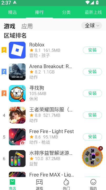 2、在游戏区域可查看详细排行榜,按热度、评分等维度展示,便于发现高人气或优质游戏资源。