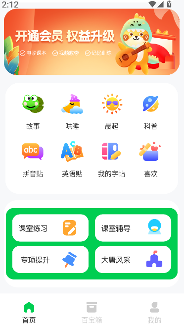 1、进入七彩课堂APP后,可在首页浏览课程学习、练习测试、错题整理等功能模块,根据学习需求选择相应内容进入。
