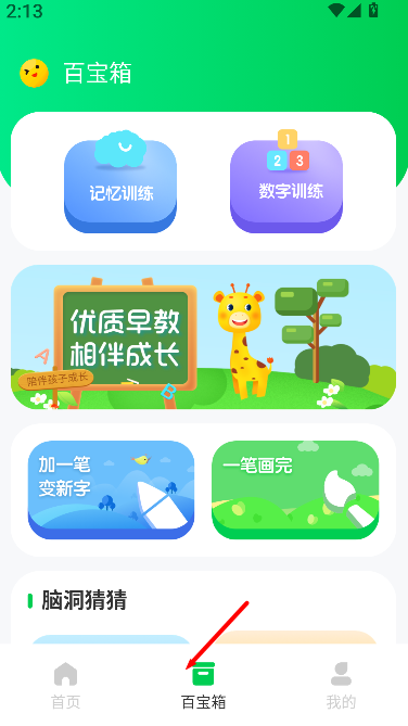 2、在首页中点击“百宝箱”板块,可进入趣味互动区,通过“脑洞猜一猜”等小游戏进行思维启发与轻松练习。