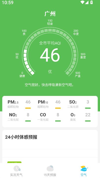 3、在城市天气页面中还可查看空气质量信息,了解PM2.5、AQI等环境指标,判断当前空气状况是否适合户外活动。