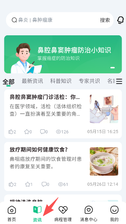 1、打开软件,点击资讯,浏览鼻腔鼻窦肿瘤相关资讯列表。
