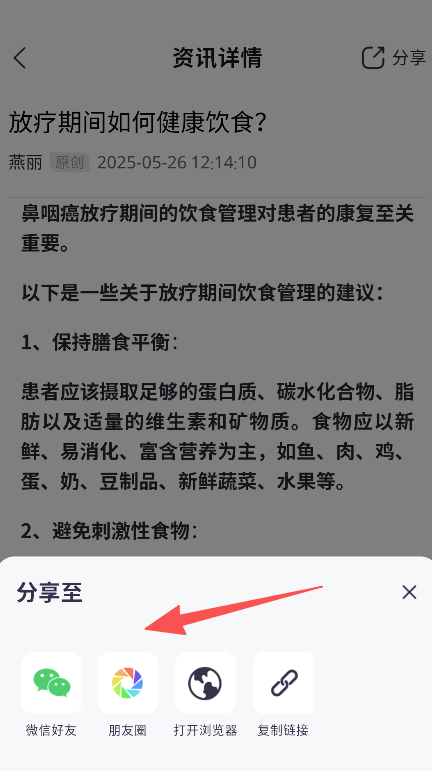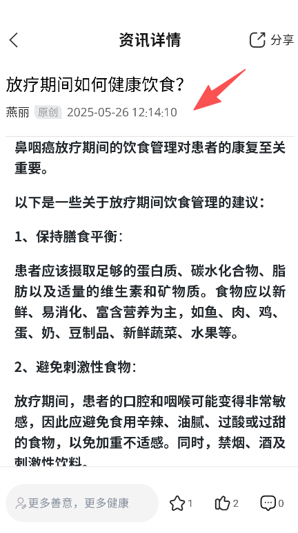 2、选择资讯(如放疗期间如何健康饮食),进入资讯详情查看内容。