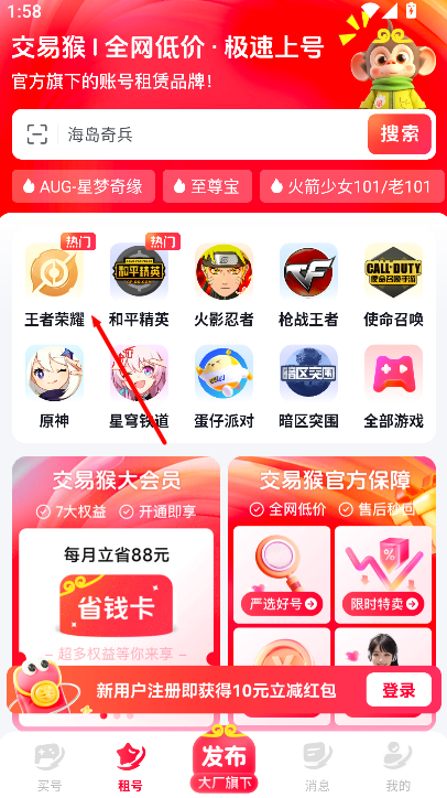1、进入首页后,点击进入“租号”板块,可浏览平台上展示的各类游戏账号资源,了解不同类型的账号租赁信息。