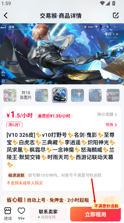 3、点击进入“交易猴”商品详情页面,确认信息无误后,选择“立即租用”即可完成下单操作并开始租赁体验。