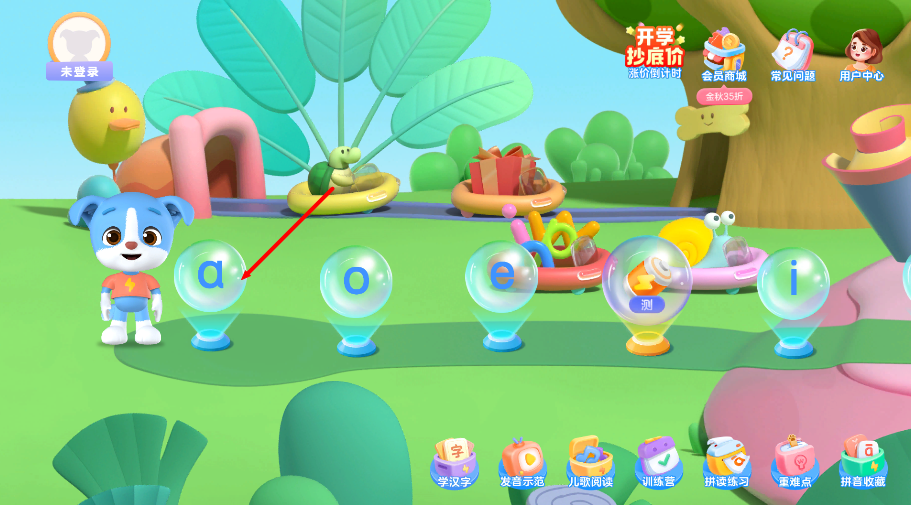 1、进入学习界面后,从字母a开始学习,界面会展示字母形状与发音,帮助认识并记忆基础拼音。