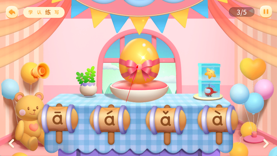 3、在声调学习环节,听取录音发音后识别声调类型,敲击屏幕上的鸡蛋完成选择,巩固声调辨识能力。