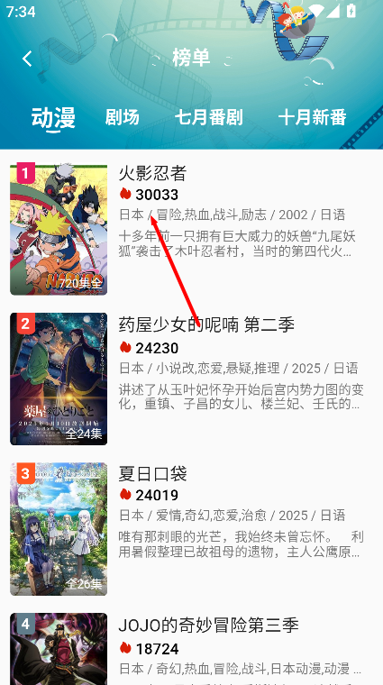 2、在榜单中找到《火影忍者》等高热度作品,点击可进入详情页面查看剧情简介、剧集目录及播放内容。