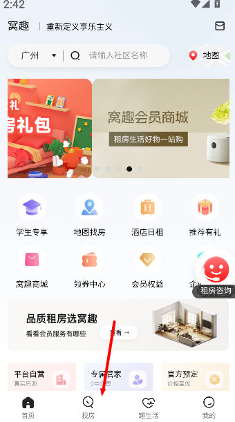 1、打开窝趣公寓软件进入主界面后,找到页面右下角的 “找房” 功能图标,点击进入房源查找专属页面。