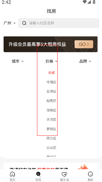 2、在找房页面顶部的城市选择栏确定目标城市,再从下方区域列表中挑选心仪区域,缩小房源搜索范围。
