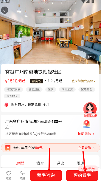 4、遇到满意的房源后,直接点击页面上的 “租房咨询” 或 “预约看房” 按钮,按提示操作即可对接相关服务。